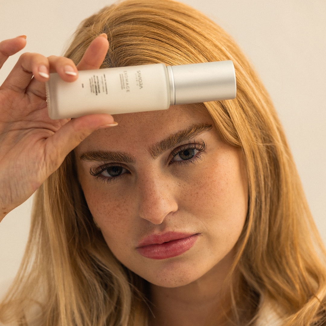 Após a limpeza da pele, aplique o Exomage. Sua ação regeneradora fortalece a barreira cutânea, melhora firmeza, aumenta a tolerância da pele ao dia e confere luminosidade natural.