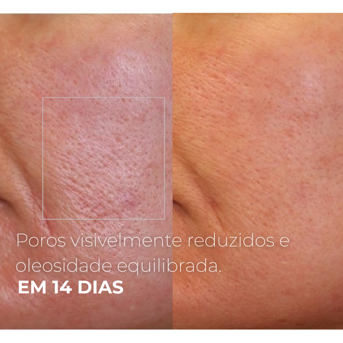 Poros visivelmente reduzidos e oleosidade equilibrada.